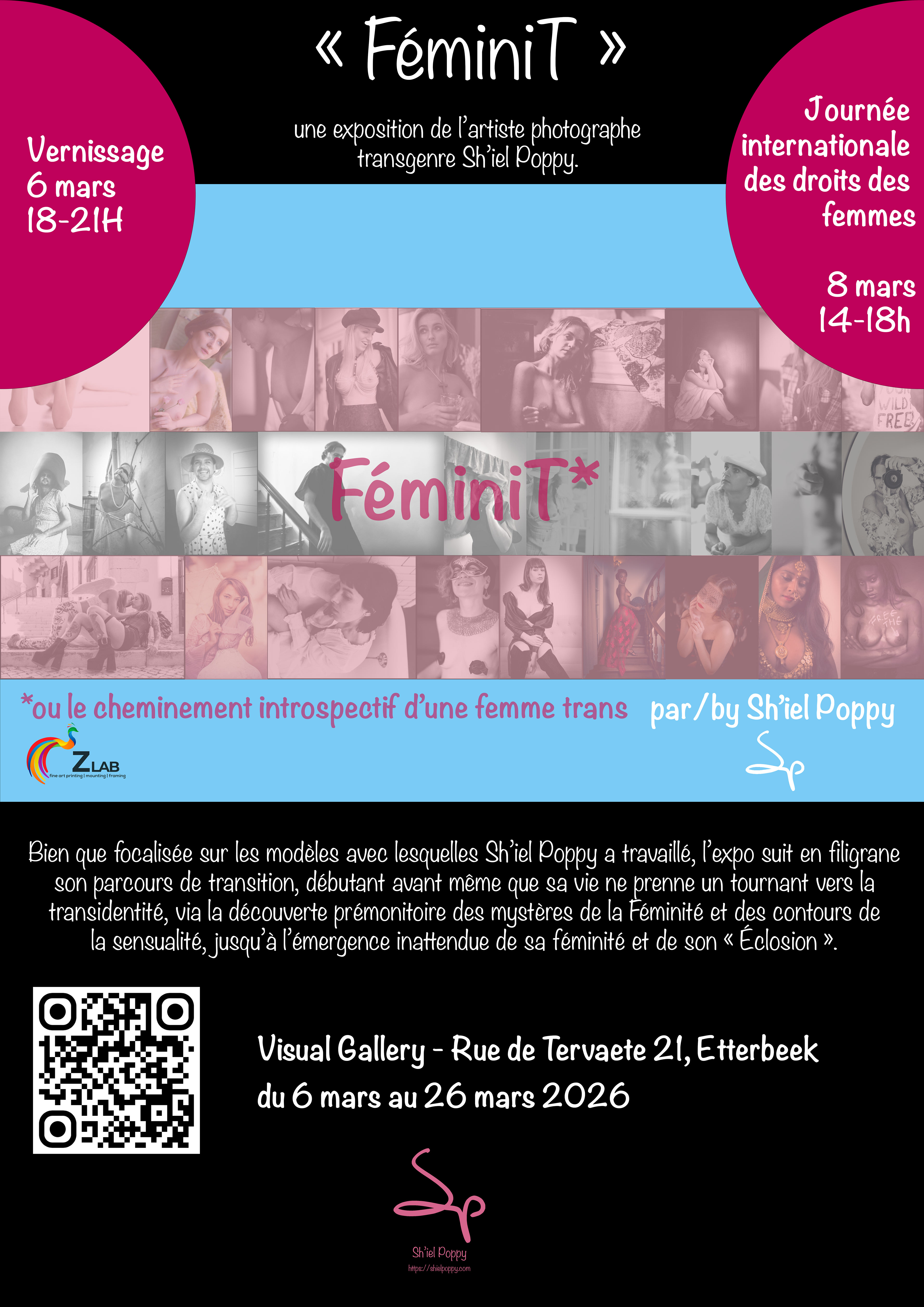 « FéminiT » est une exposition de l’artiste photographe transgenre Sh’iel Poppy. Bien que focalisée sur les modèles avec lesquelles elle a travaillé, l’expo suit en filigrane son parcours de transition, débutant avant même que sa vie ne prenne un tournant vers la transidentité, via la découverte prémonitoire des mystères de la Féminité et des contours de la sensualité, jusqu’à l’émergence inattendue de sa féminité et de son « Éclosion ».